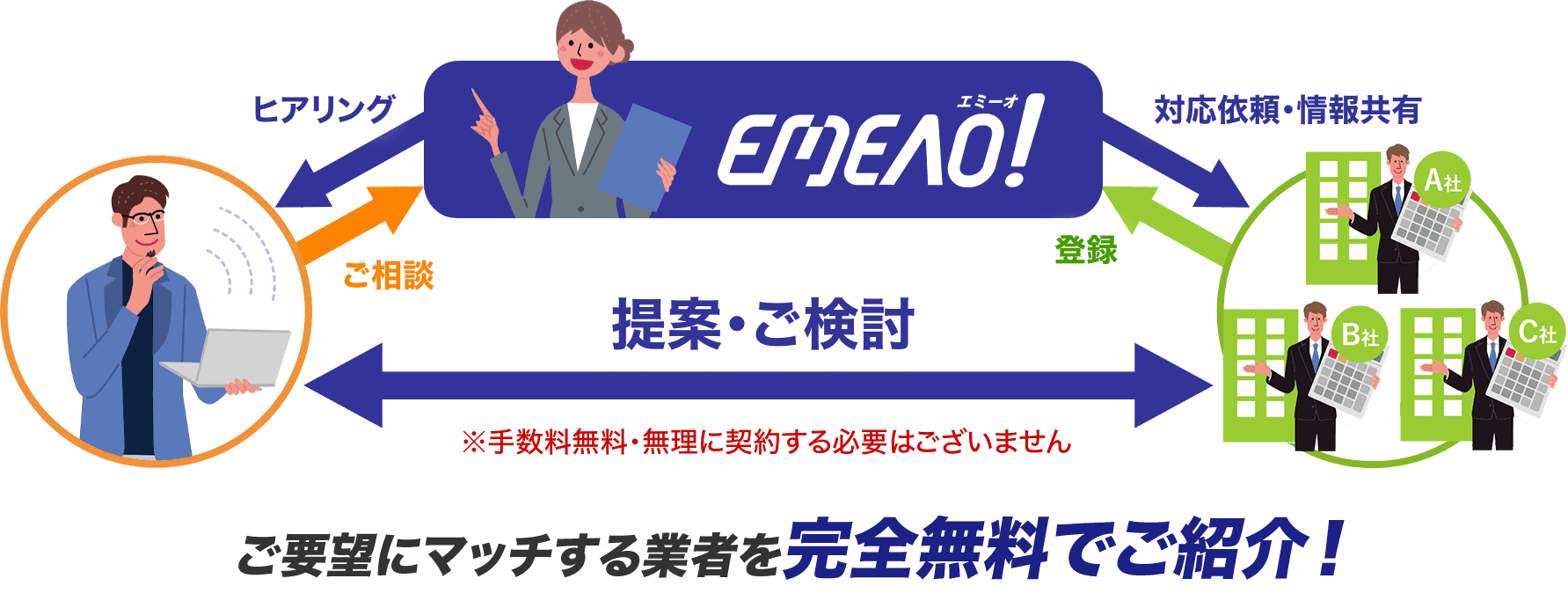 ご連絡から打ち合わせまで、一切費用を頂くことはありません。もちろん、契約が決まってもEMEAO!から何かしらの請求をすることも一切ございません。安心してご利用ください。