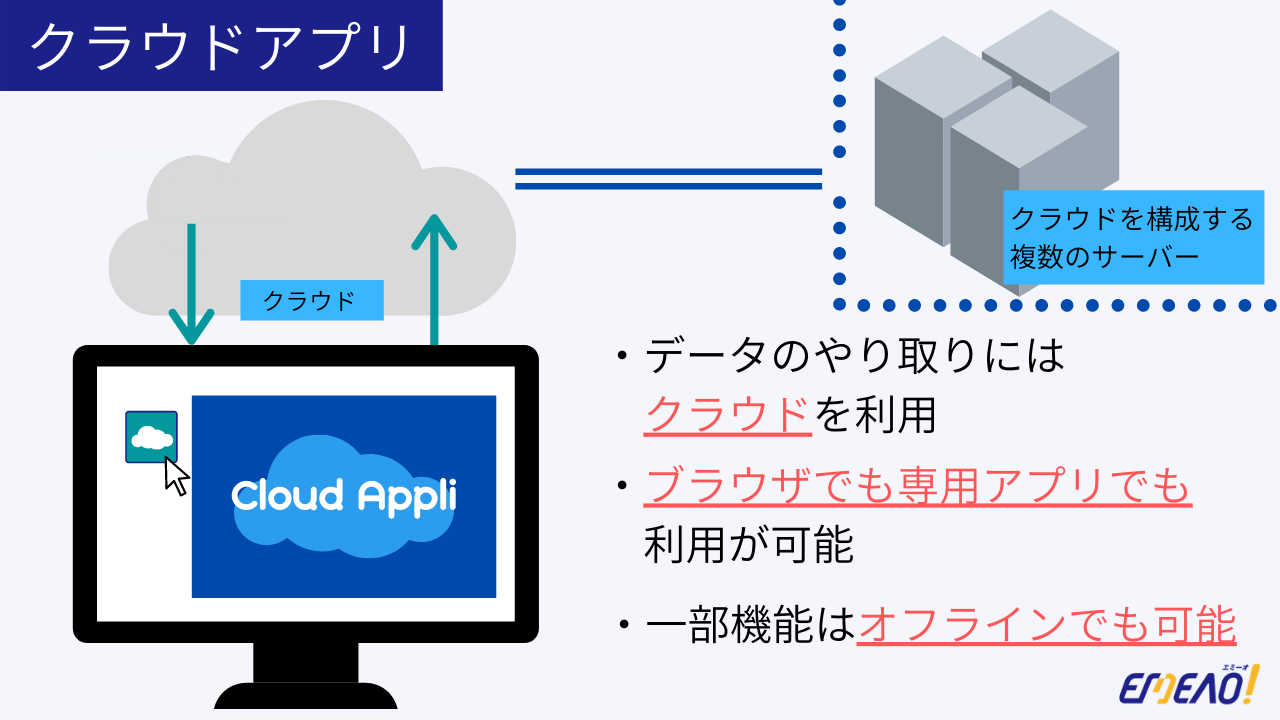 インターネット環境を通じサービスを利用する仕組みはWebアプリと同じですが「クラウド」という仮想サーバー上にシステムを接続し利用する仕組みになっている点が、Webアプリと大きく異なるポイントです。