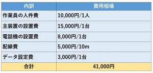 上記以外の費用として、主装置と各端末を接続・設定するシステム設定費が10,000円程度、電話線固定のために使用する材料費が10,000円程度かかる場合があります。