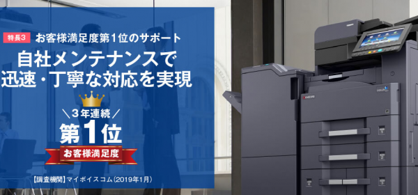 特徴は豊富なラインナップとリーズナブルな料金です。アフターサポートも充実しており、モノクロ複合機は購入後3か月、カラー複合機は6か月までの故障やトラブルを原則的に無料で修理します。初めてOA機器を導入する方にも安心のサービスです。