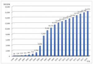 付与事業者数の推移(1998年度~2019年3月31日時点)