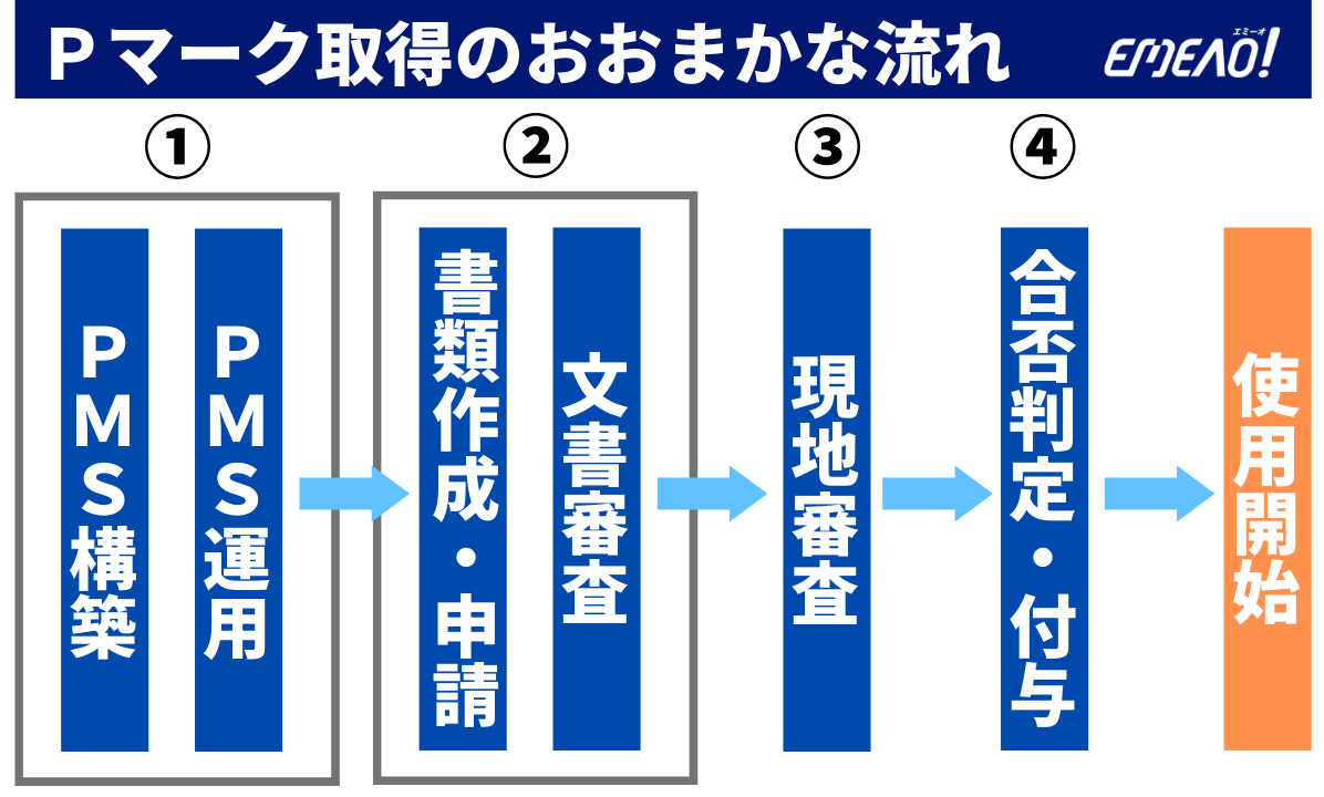 つづいてPマークを取得するためにやるべきことの流れと、それぞれの過程にかかる時間をご紹介します。 以下に、Pマークを取得するためのおおまかな流れをまとめました。