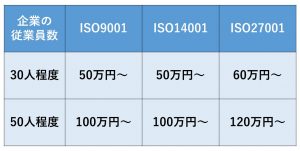 ISO認証のなかでも、代表的な規格である「ISO9001」「ISO14001」「ISO27001」の基本費用の相場を下記するので、確認してみてください。