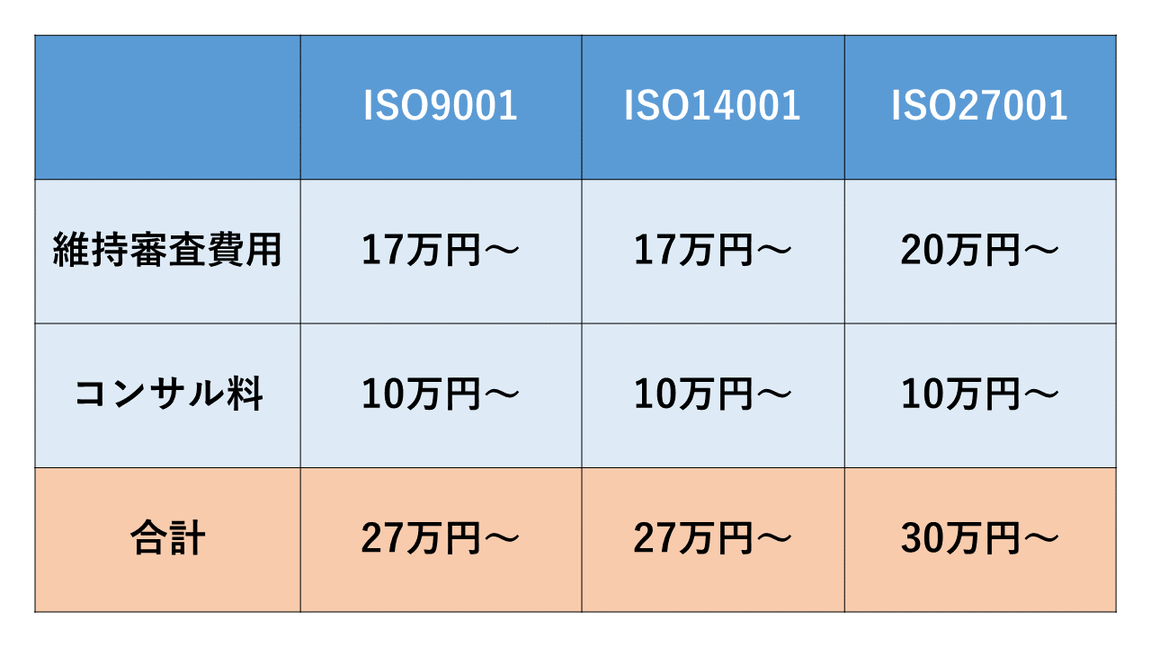 また、確実に審査に通過してISO認証を維持・更新するために、コンサルにサポートを依頼する場合はコンサルt料金が別途必要になります。