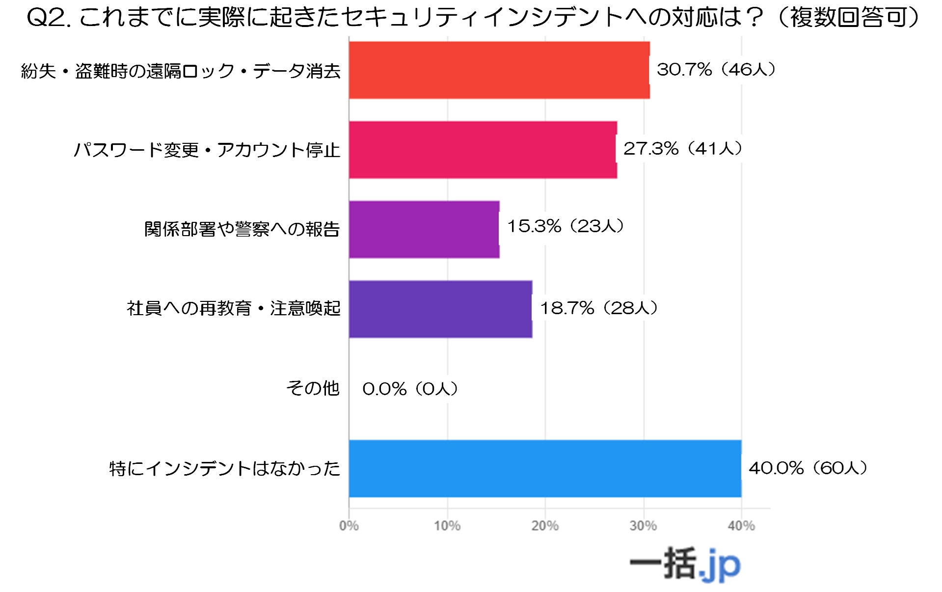 - 一方で、何らかのインシデント対応を経験した企業も多く存在します。「紛失・盗難時の遠隔ロック・データ消去」は30.7%(46人)、「パスワード変更・アカウント停止」は27.3%(41人)となっており、端末の物理的な紛失やアカウントへのリスク発生時に情報漏洩リスクを最小限に抑える対策が取られているようです。