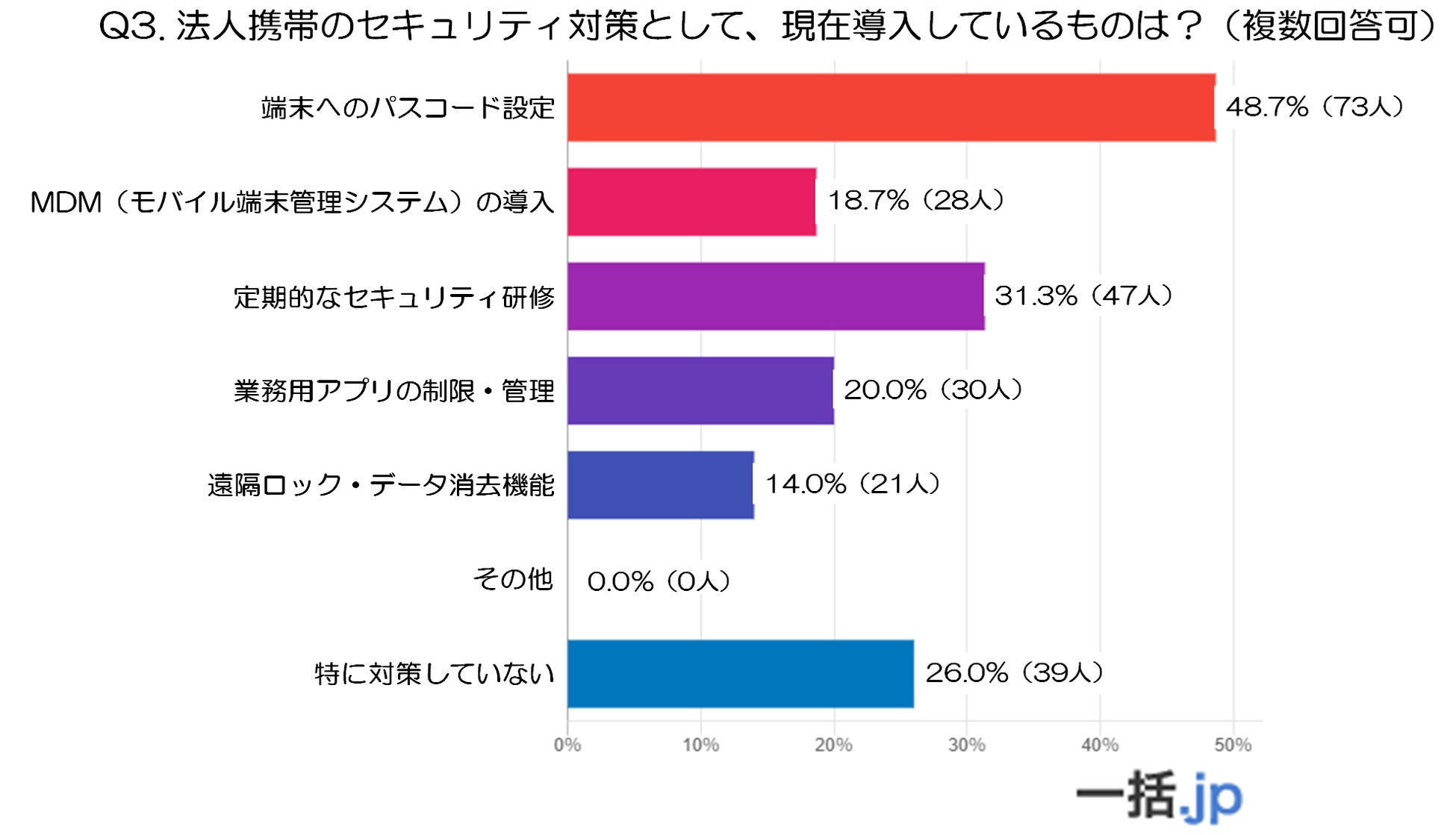 - 「業務用アプリの制限・管理」(20.0%、30人)と「MDM(モバイル端末管理システム)の導入」(18.7%、28人)は、合わせると約4割となっており、アプリや端末をシステム的に一元管理する対策も多く取り入れられているようです。
