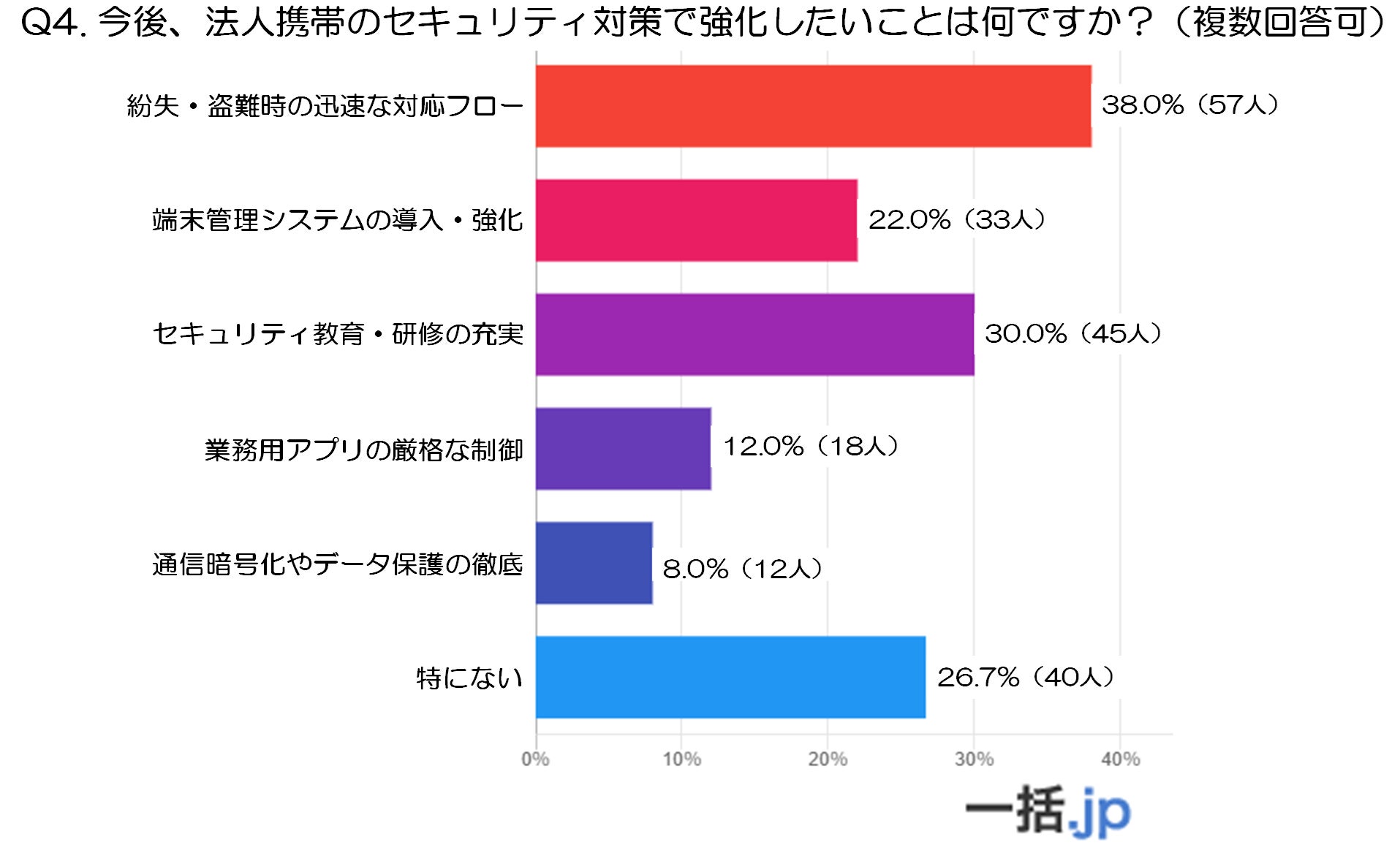 - 今後強化したい取り組みとしては、「紛失・盗難時の迅速な対応フローの構築」や「セキュリティ教育・研修の充実」が多く挙げられており、組織としての危機管理体制や従業員のリテラシー向上が今後の大きな課題と考えられます。