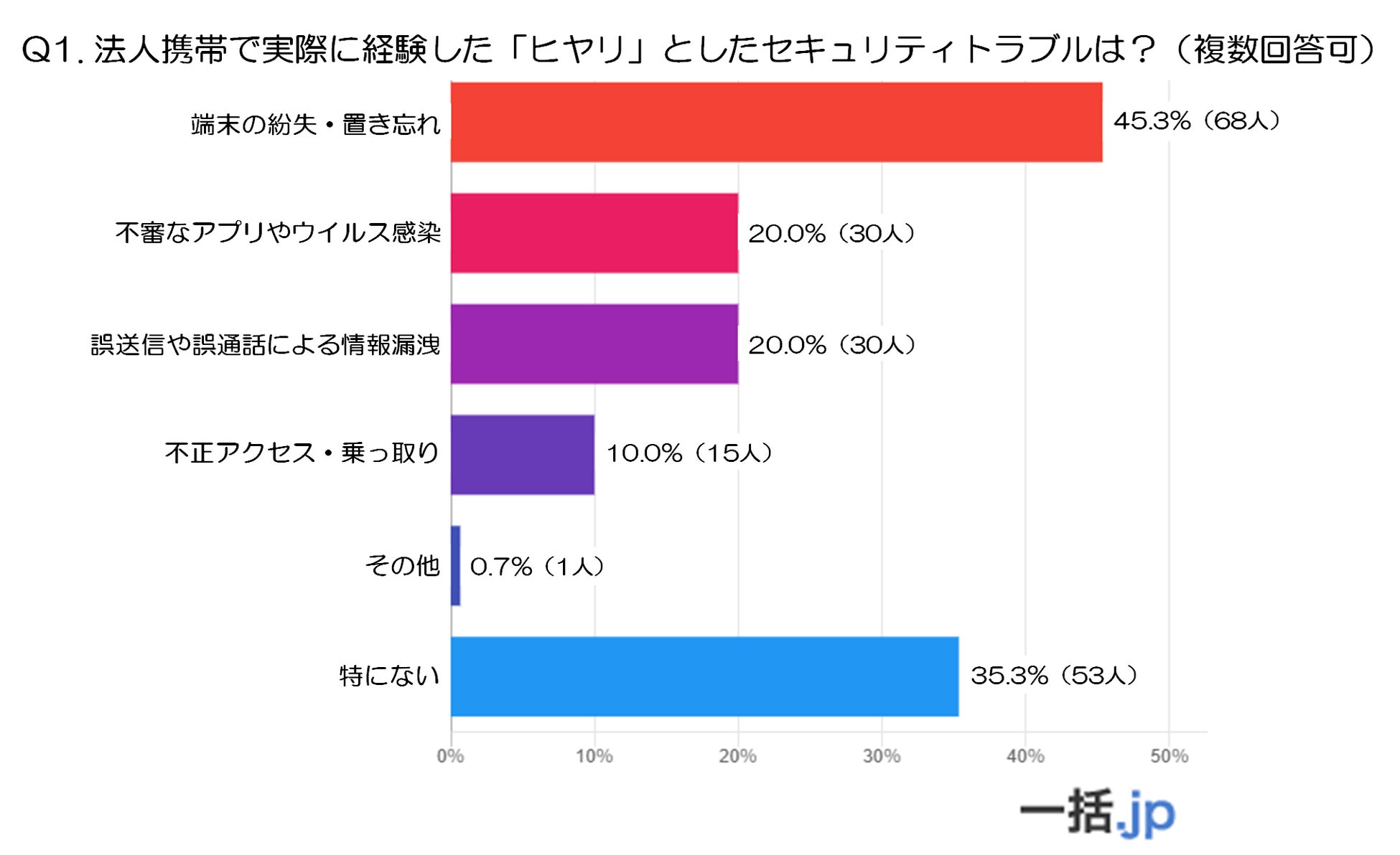調査結果1:法人携帯で実際に経験した「ヒヤリ」としたセキュリティトラブルは? ※複数選択可