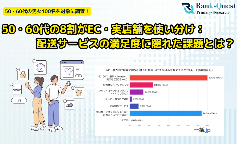 本記事では、発送代行・物流倉庫業者のマッチングサイト『一括.jp(https://emeao.jp/ikkatsu-column/logistics-warehouse-market-price/ )』が50・60代の男女100名を対象に実施したアンケート調査の結果をもとに、多様化する購買チャネルの利用実態と、物流サービスに対するリアルな評価や改善への具体的な要望を明らかにします。