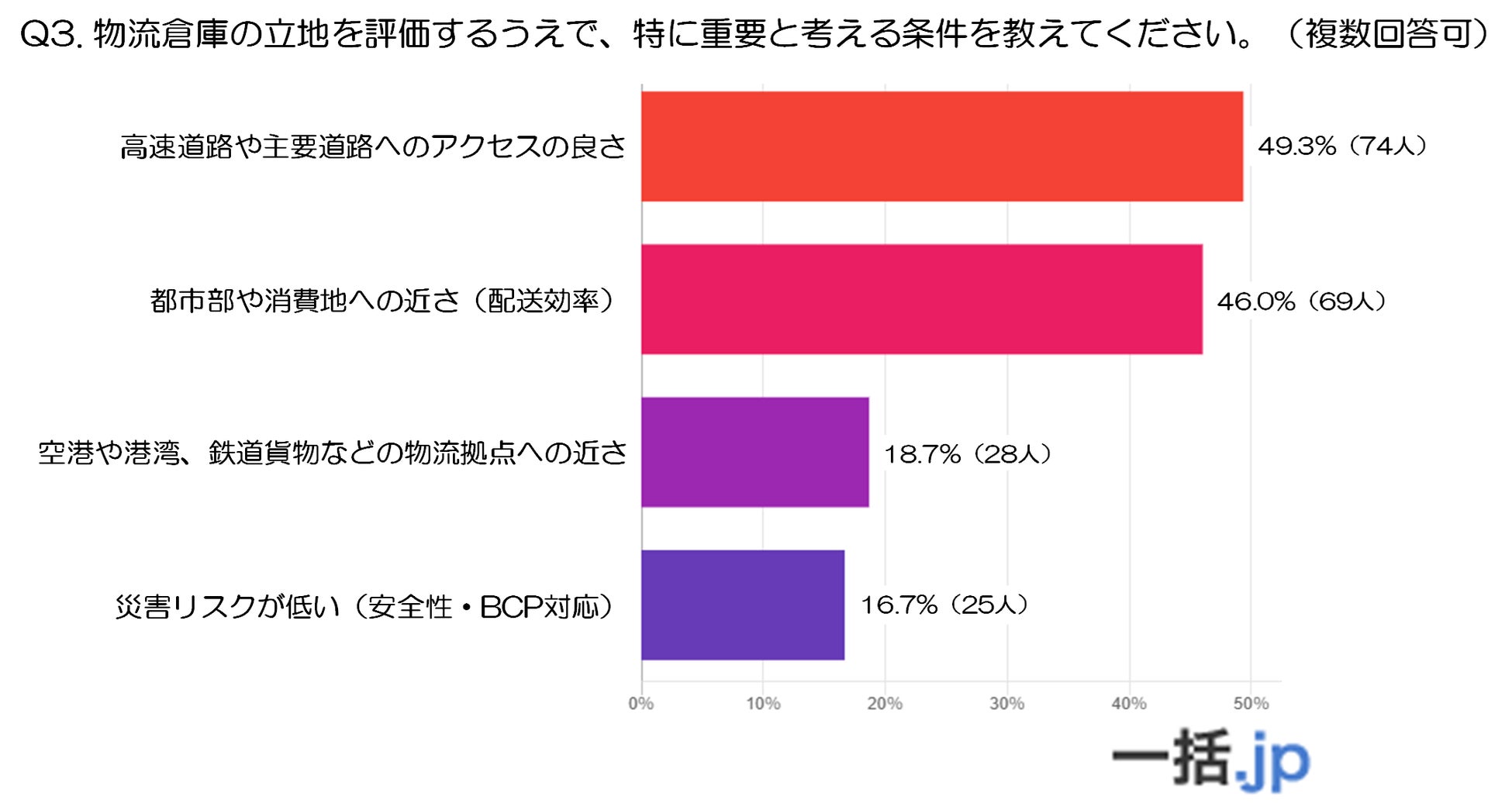 - 次いで多かったのは「都市部や消費地への近さ(配送効率)」で46.0%(69人)となっており、消費地までの距離が短いほど配送コストや時間が削減できる点が評価されています。都市部へのアクセスのしやすさも、物流戦略を考えるうえで欠かせない要素です。