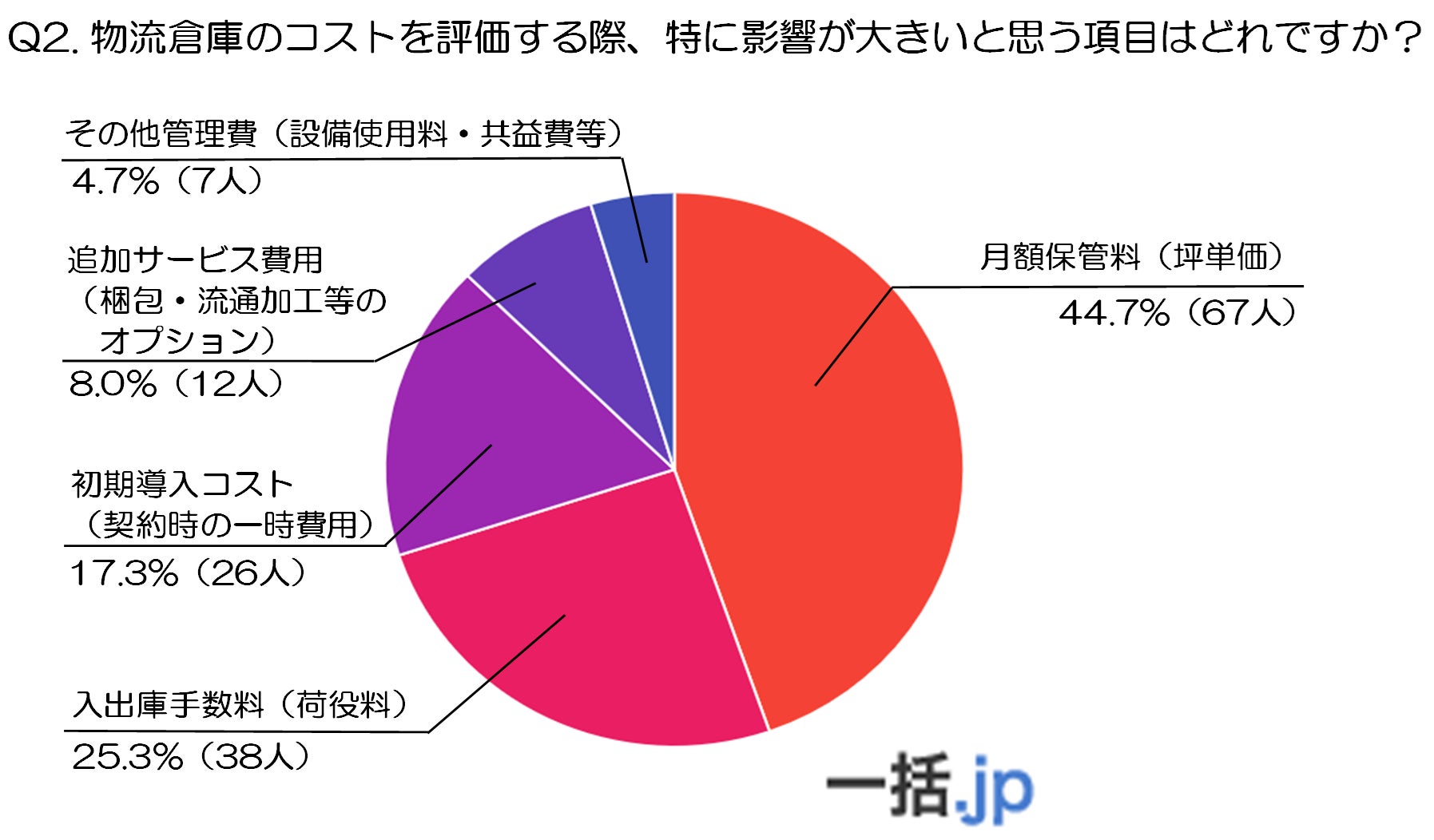 - さらに、「初期導入コスト(契約時の一時費用)」については17.3%(26人)の回答がありました。契約時に一度だけ発生する初期費用も注目されていますが月額保管料や荷役料など日常的なコストと比べると、優先順位はやや低くなっているようです。