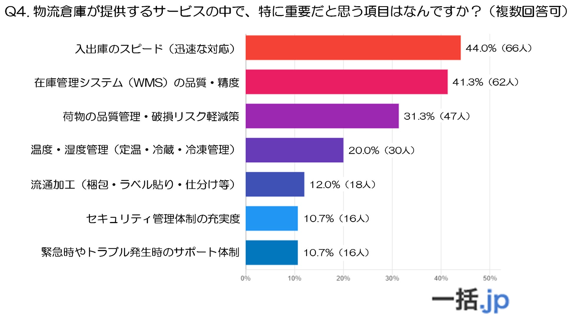 - 最も多かったのは「入出庫のスピード(迅速な対応)」で44.0%(66人)が選んでおり、現場でのオペレーション効率やリードタイム短縮が強く求められていることがわかります。
