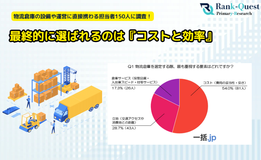 そこで、物流倉庫及び発送代行業者を厳選して紹介するBtoBマッチングメディア『一括.jp(https://emeao.jp/ikkatsu-column/shippingagency_recommendation/ )』は、物流倉庫の設備や運営に直接携わる担当者150人を対象に「倉庫選びの決め手」となる評価項目についてアンケート調査を実施しました。