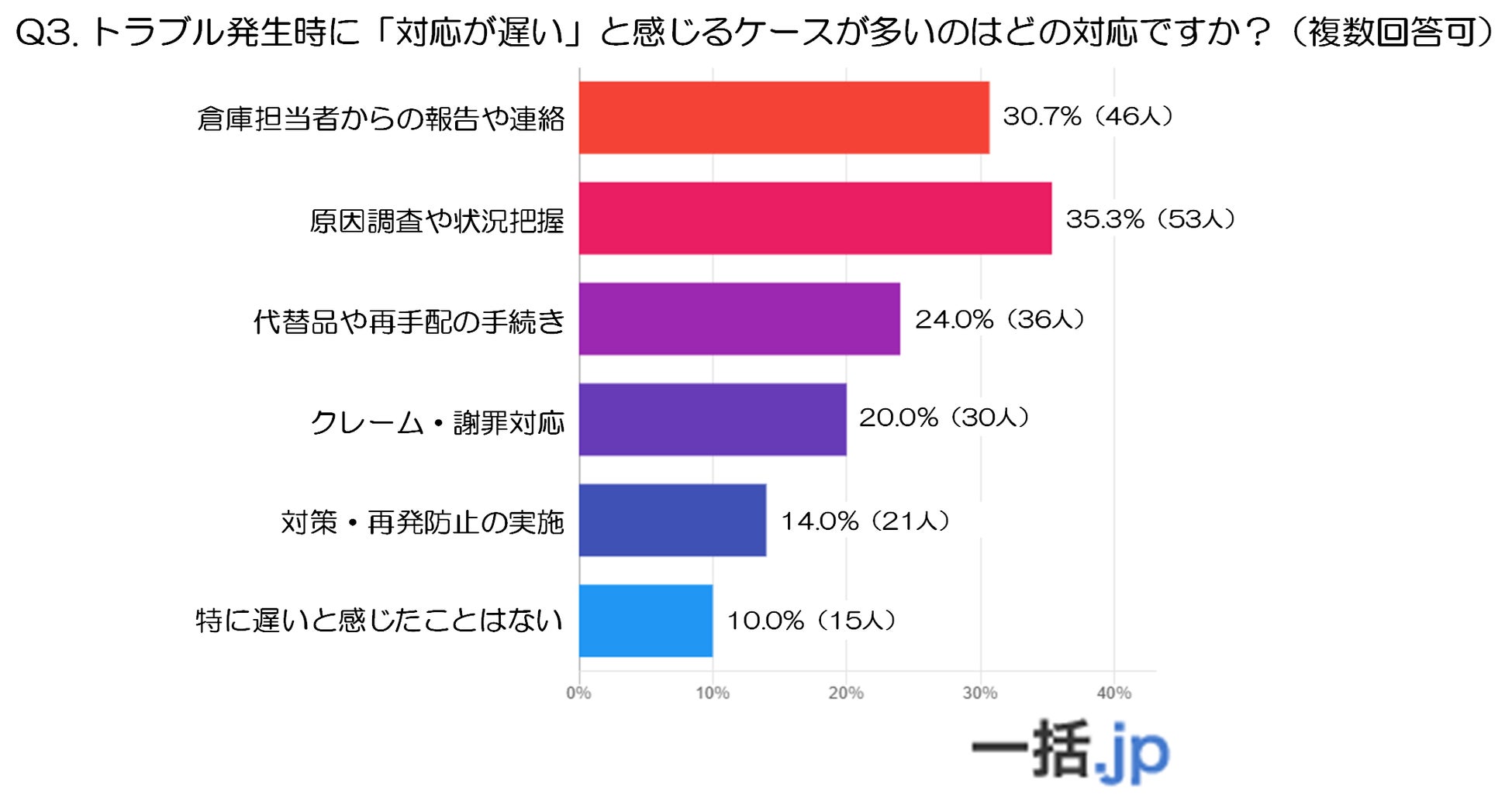 - 次いで「倉庫担当者からの報告や連絡」(30.7%、46人)が挙げられており、現場から管理者や顧客への情報伝達のスピードにも課題が残っていることが分かります。