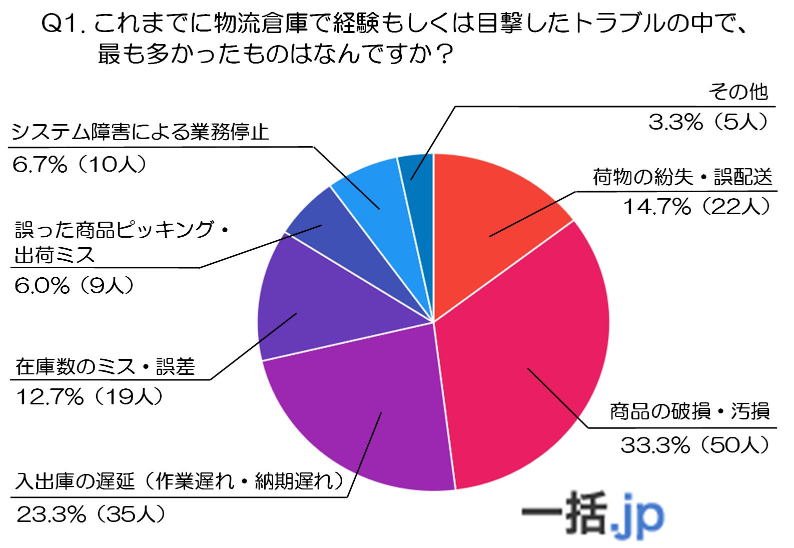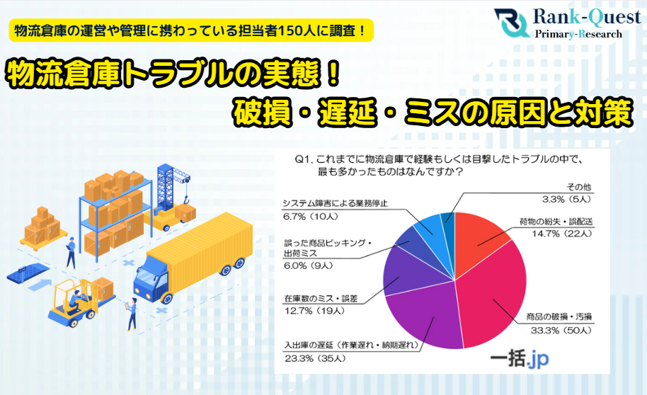 そこで今回、物流倉庫を厳選して紹介するBtoBマッチングメディア『一括.jp(https://emeao.jp/ikkatsu-column/logistics-warehouse-market-price/ )』は、実際に物流倉庫の運営や管理に携わっている担当者150名を対象にアンケート調査を実施し、倉庫現場で発生したトラブルや、その要因、対応の課題点、今後強化したい取り組みなどを多角的に調査・分析しました。