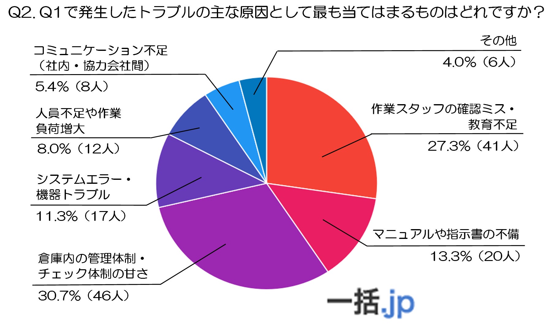 - 最も多かったのは「倉庫内の管理体制・チェック体制の甘さ」で、30.7%(46人)が選択しています。管理・チェック体制の不備がトラブルの根本的な原因となっているケースが多く、現場のルールや監督体制の強化が重要課題となっていることがうかがえます。
