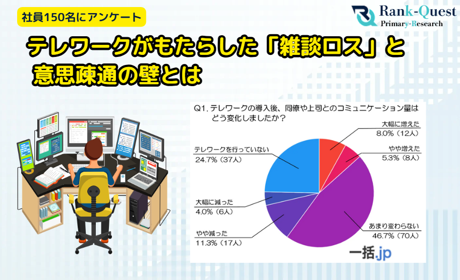 そこで今回、厳選した業者を紹介する法人携帯マッチングサイト「一括.jp(https://emeao.jp/ikkatsu-column/recommend_mobilephonecompany/ )」は150名を対象にアンケート調査を実施し、 テレワーク導入後のコミュニケーションの頻度や利用ツール、現場で社員が実際に感じているリアルな悩みや課題について率直な声を集めました。