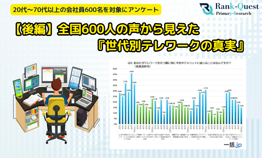 一方で、特に不安を感じない層も一定数存在し、世代や職種に応じたサポートと働き方の設計が、テレワークの効果を最大化するポイントとなりそうです。