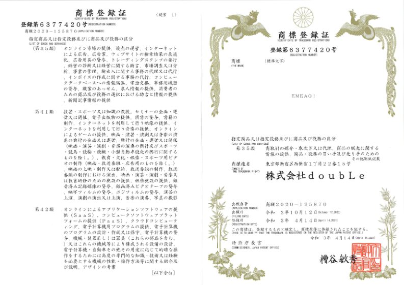 この度、EMEAO!の運営事務局である株式会社doubLeが特許庁へ出願しておりました「EMEAO!」「エミーオ」が、特許庁より正式に商標登録されましたのでご報告いたします。