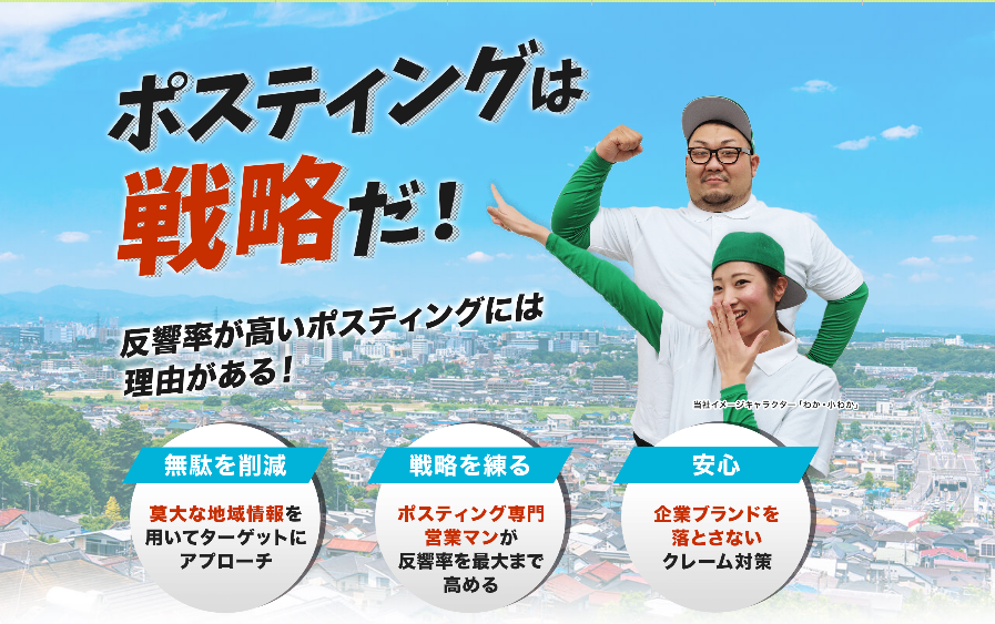 弊社は、ポスティング業界最安値とサービス満足度の両方でNo.1を目指しています。 料金には絶対の自信があります。また、GIS(地理情報)システムを使った圧倒的なターゲティング能力で、無駄を省き反響率の高いポスティングを行なっております。 業種や目的にあった戦略的なポスティングプランをご用意しますので、効果的なチラシの配布エリアや方法が分からないというお客様もお気軽にご相談ください。